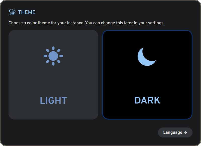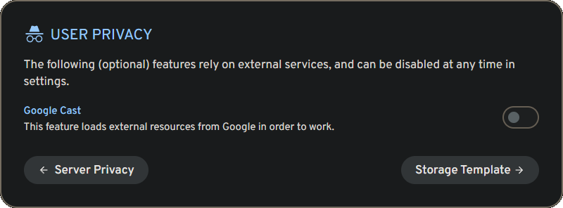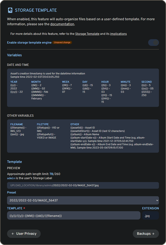 Entering the IP address of the LXC container with port 2283 brought me to the Immich web interface and the initial setup wizard. I first had to create an administrator account after which I logged in to proceed with the setup. I was then asked to select Light or Dark theme, my language preference, server privacy options, user privacy options, and then finally to configure to the Storage Template.