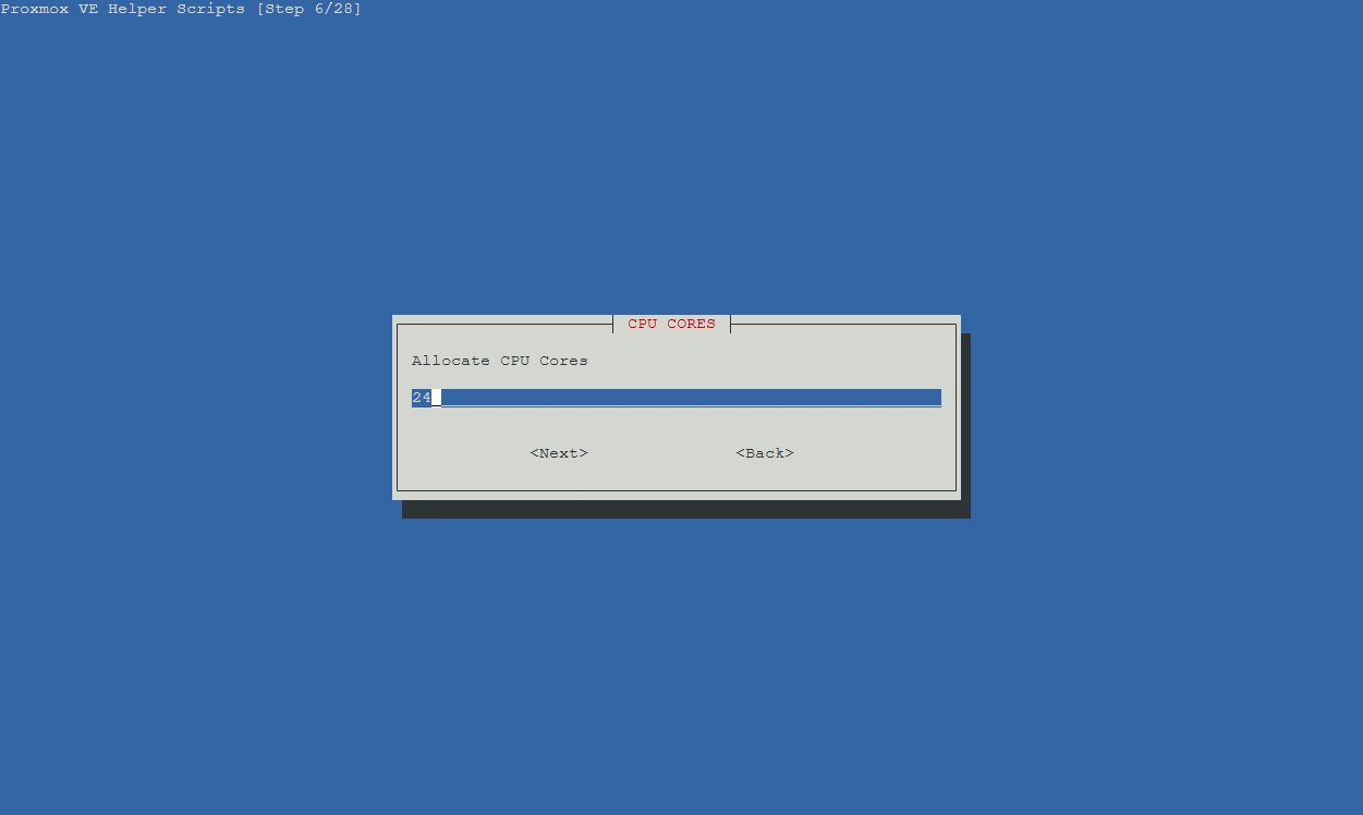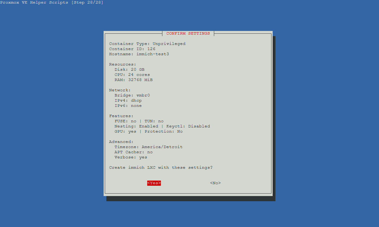 Once the script loaded I chose Advanced Install so that I would have access to all of the configurable options. I created the container using most of the default settings but I increased the CPU cores to 24 and gave it 32GB of RAM since I knew Immich would use the processing power after dumping the entire contents of my phone. Once the dump was complete and the processing jobs complete (more on those later) I reduced the resources to 4 cores and 4GB of RAM. The default disk size was 20GB and I left that alone. Since I keep IPv6 disabled in my homelab I disabled it in the container as well. I also enabled SSH access for root and verbose mode for the installation output. Once I specified the virtual disk location the script ran.