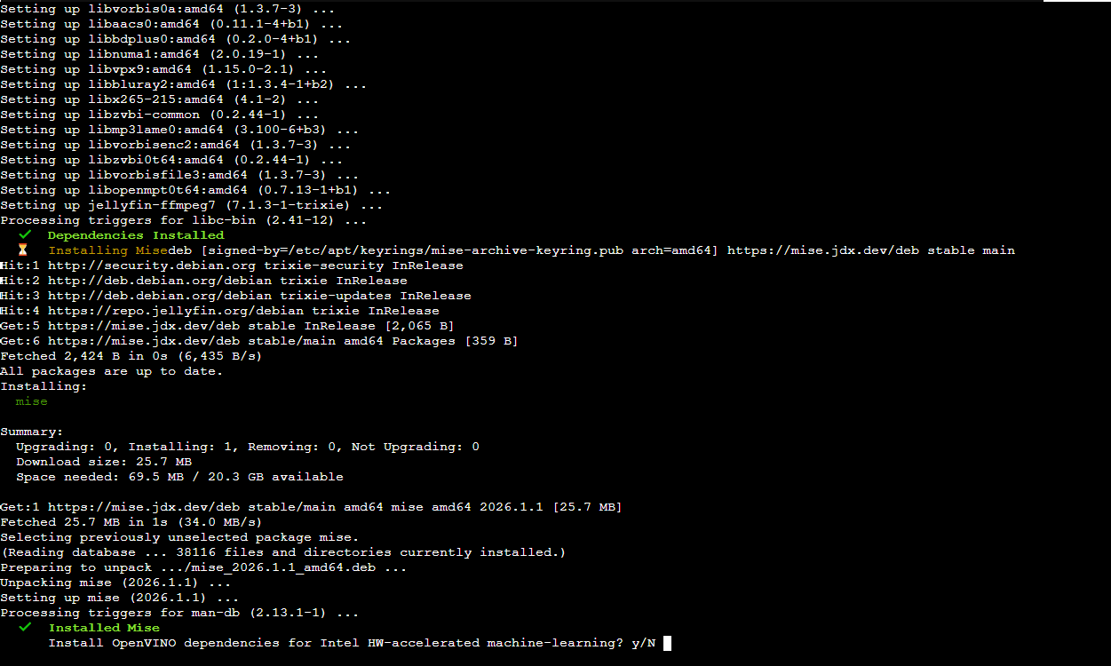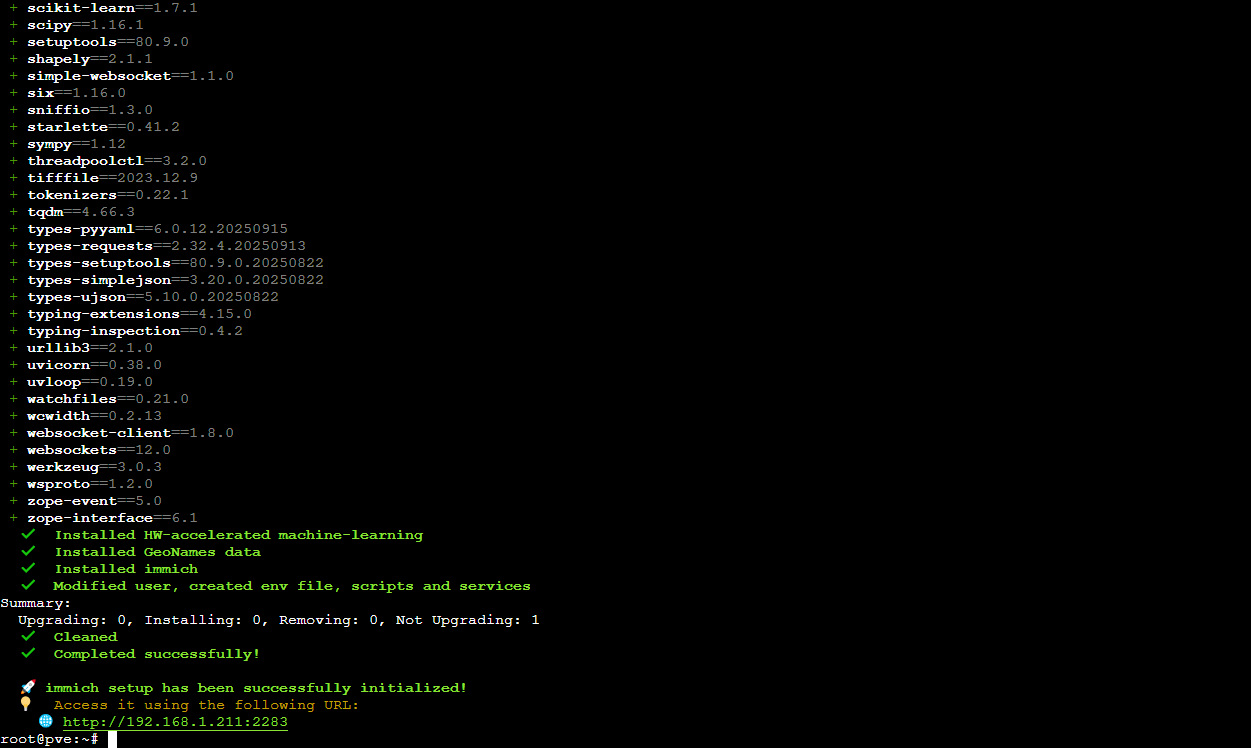 During the installation I was prompted to install the OpenVINO dependencies for hardware-accelerated machine learning to which I said “yes”. The Dell R730XD server that runs Proxmox in my homelab doesn’t have a GPU but it can certainly accept one, so I opted to install the dependencies and if I ever need to install a GPU for Immich or other services that would make use of one, such as self-hosted AI LLMs for agentic use or with Home Assistant (I would LOVE to make a voice activated setup that uses Vega’s voice profile from Doom 2016 and Eternal), the option is there.